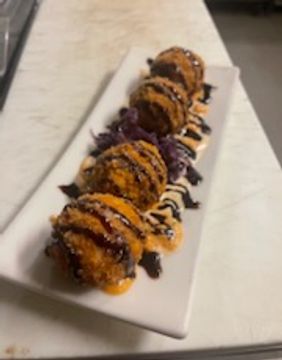 Rice panko breaded mash, corned beef and Swiss. Deep fried with two sauces